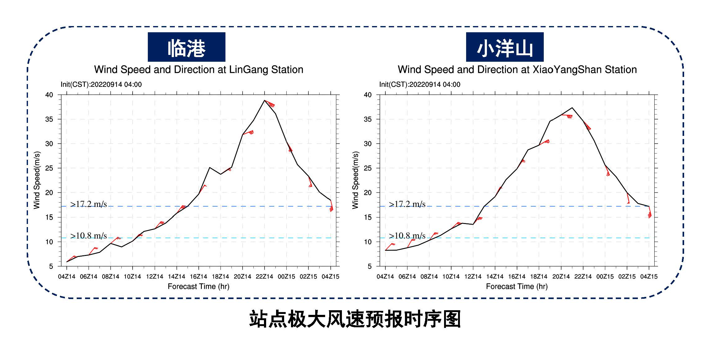 逐小时滚动更新未来24小时指定区域风场预报,包括风向和风速。